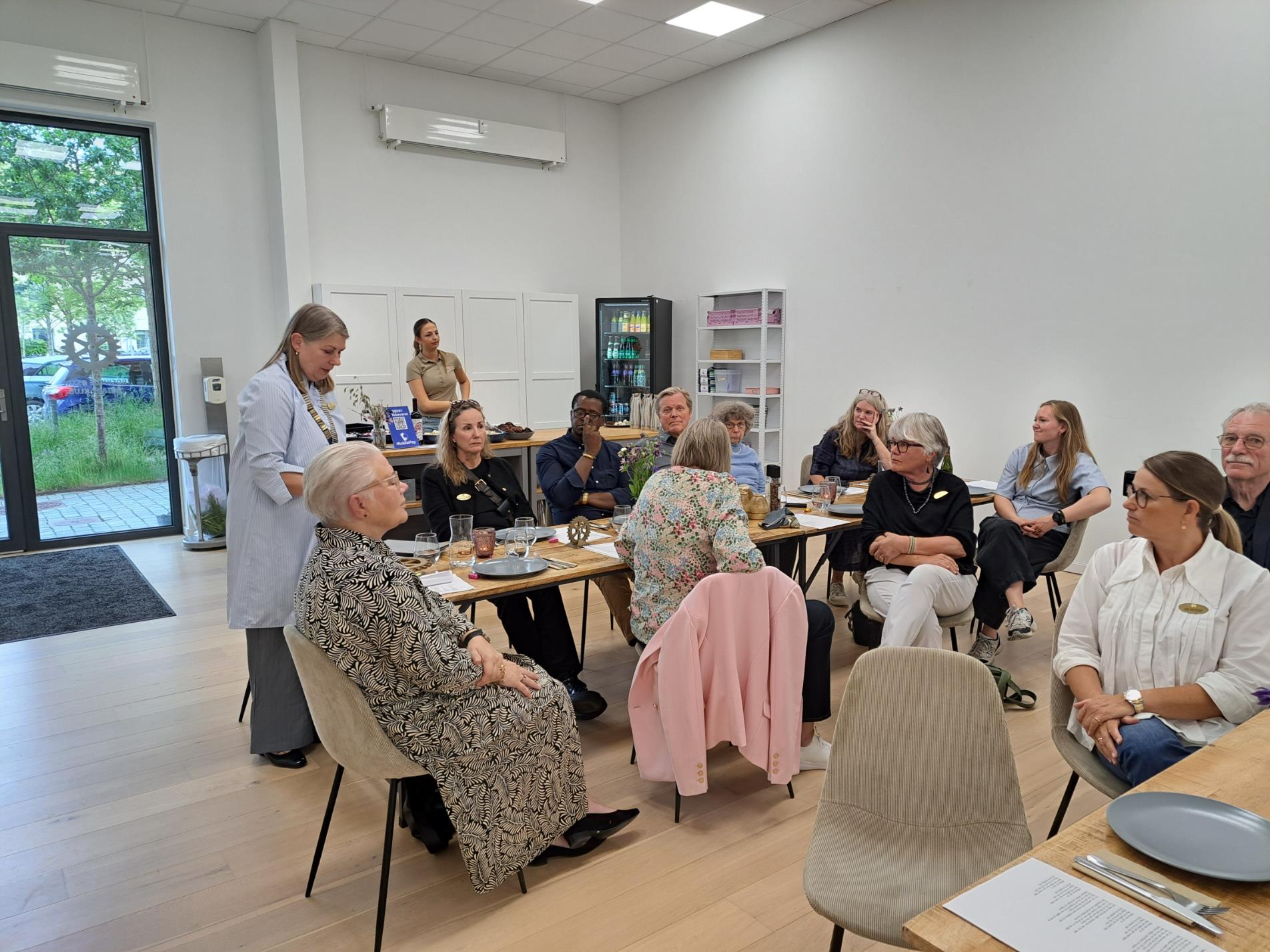 Efter en mellanlandning med bakelser och kaffe på ett kafé, pittoreskt beläget vid hamnen, åkte vi till deras ordinarie rotarymöte. Man inledde mötet med sång på svenska. Dessvärre kände vi inte riktigt till dessa sånger! Det serverades sedan ”frikadeller” och potatissallad. Kvällens programpunkt var … just det, VI. Vi hade förberett ett litet bildspel och så presenterade vi oss själva. Det blev en "morsom" kväll att minnas.